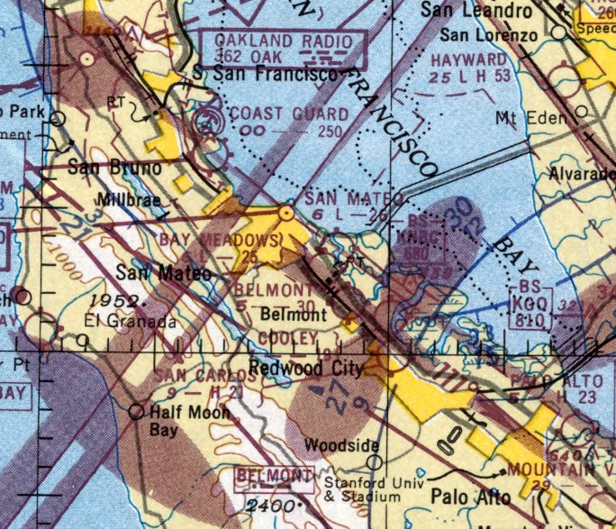 The last aeronautical chart depiction which has been located of Belmont Airport was on the 1949 San Francisco Local Aeronautical Chart (courtesy of Chris Kennedy).