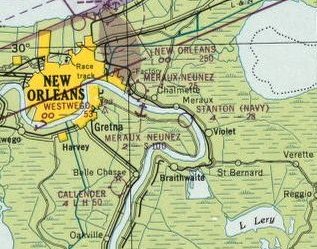 The last aeronautical chart depiction which has been located of Meraux-Neunez Airpark was on the 1949 Sectional Chart (courtesy of Jonathan Westerling).