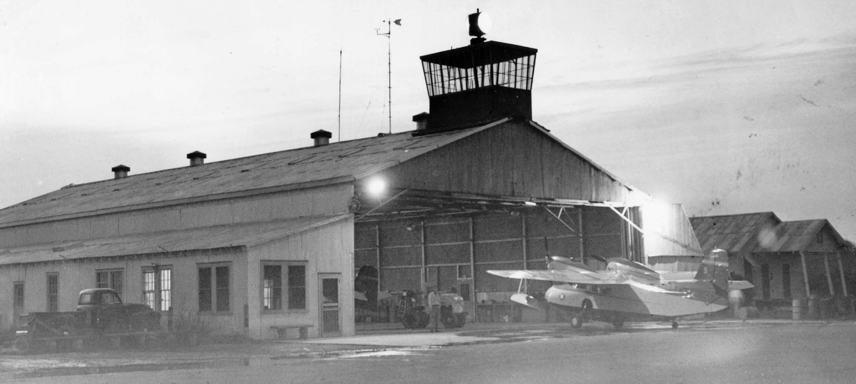 A 3/12/52 photo (courtesy of Gary Frey) a Grumman Widgeon operated by McDermott Construction in front of the Alvin Callender Airport hangar.