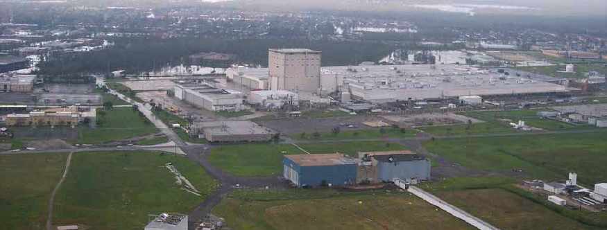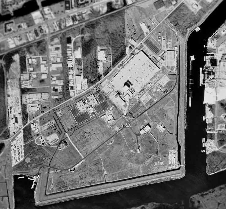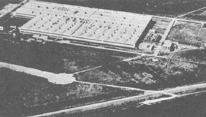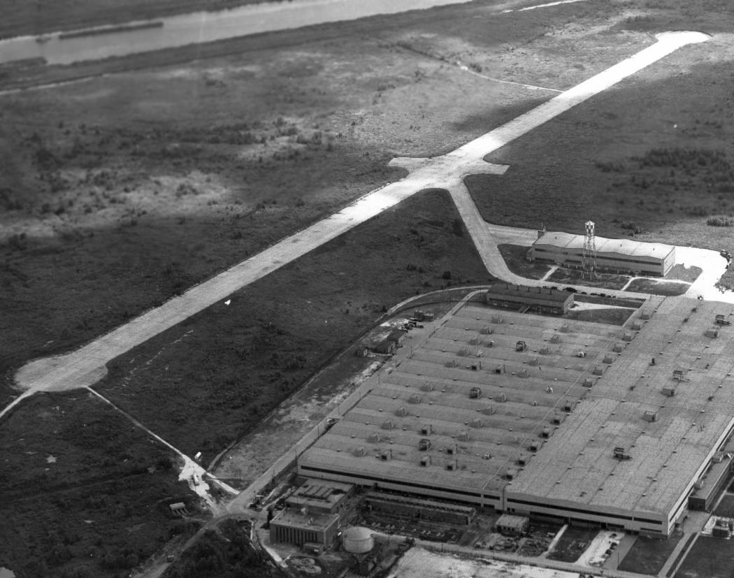 A circa 1940s aerial view looking southwest at the Michoud factory airfield, with the factory in the foreground (courtesy of Carl Hennigan).