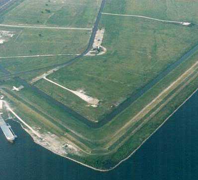 A circa 2006 aerial photo looking east at the Harvey VORTAC beacon which sits over the former east/west runway.