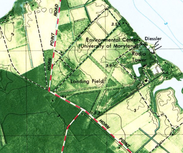 The 1982 USGS topo map depicted Horn Point Aerodrome as having 3 unpaved runways, generically labeled as “Landing Field”.