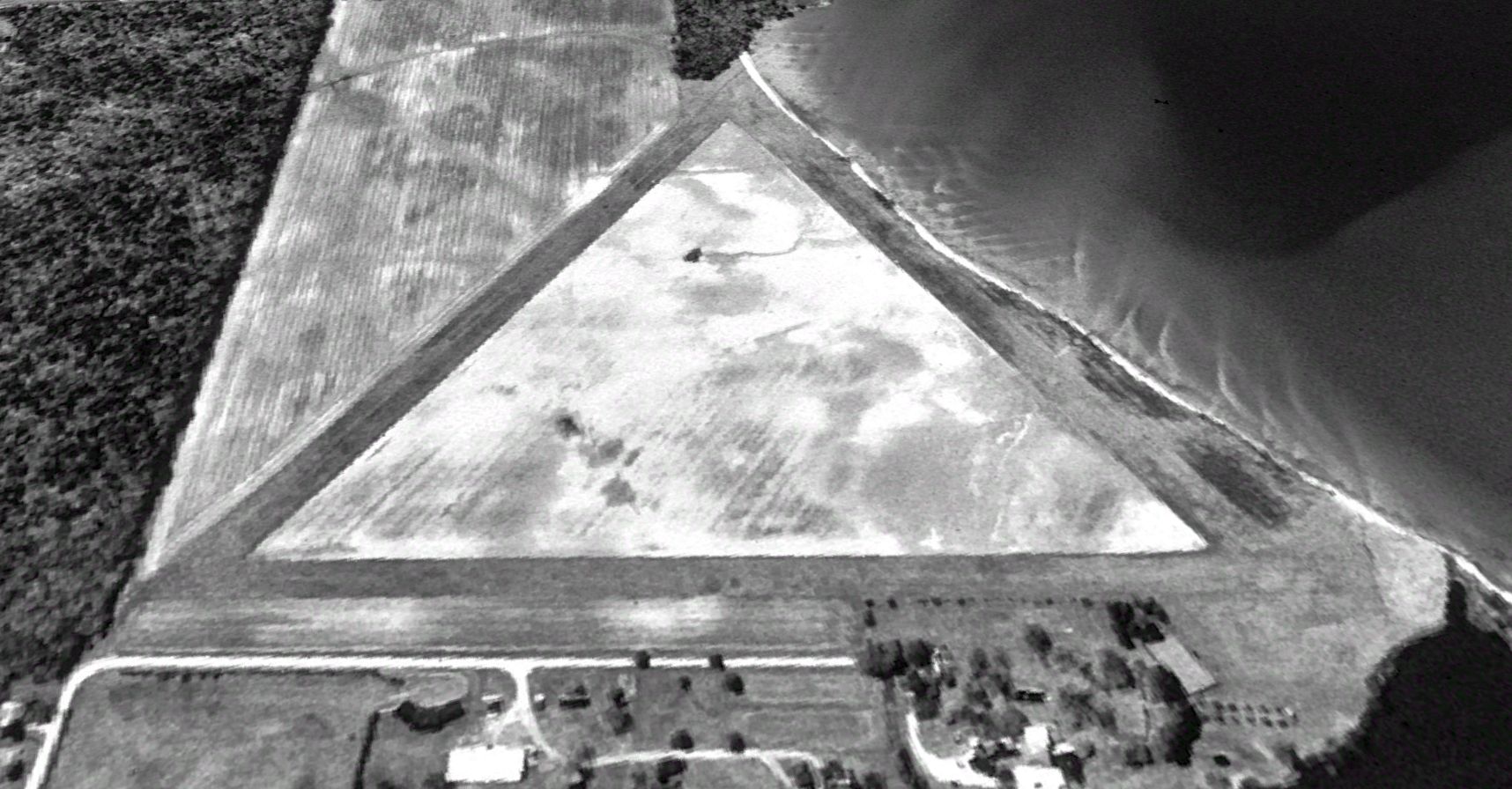 A 2024 aerial view looking southwest showed the triangular layout of the Talisman Farm Airfield was still recognizable, but the runways were no longer maintained.