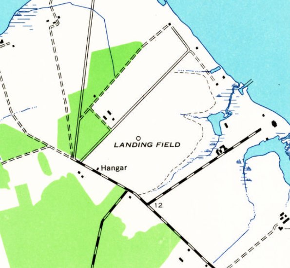 It depicted Horn Point Aerodrome as having 3 grass runways, with a few small buildings on the west side.