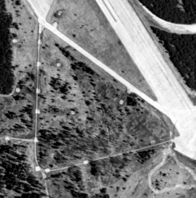 A close-up from the 1994 USGS aerial view showing the former Skysweeper Anti-Aircraft Artillery pads on the southwest corner of the Raco site.