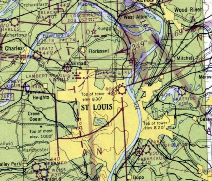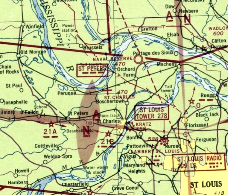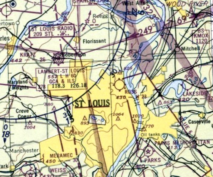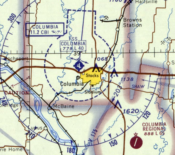 The last aeronautical chart depiction which has been located of Columbia Airport was on the February 1969 Kansas City Sectional Chart.