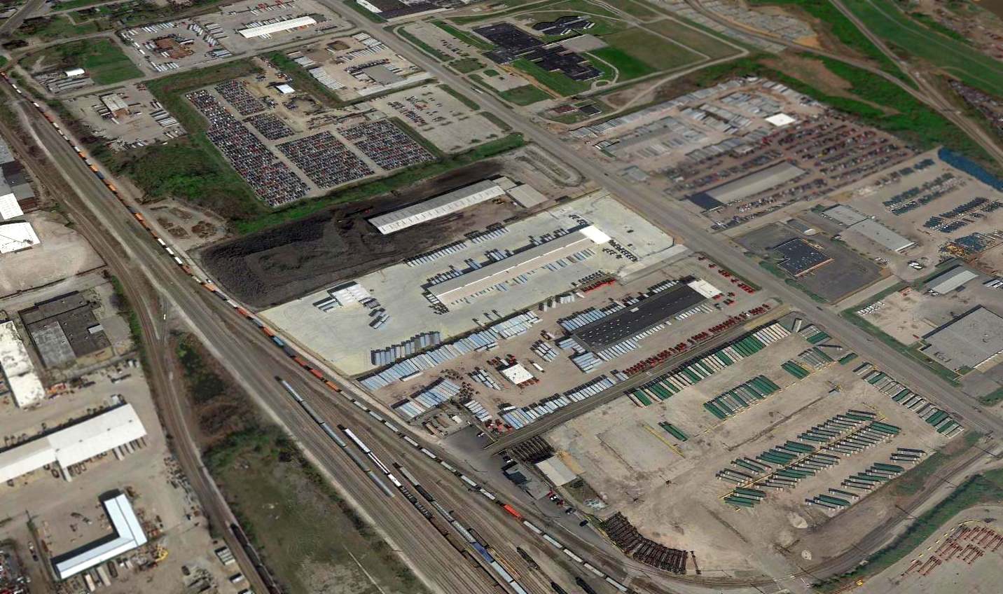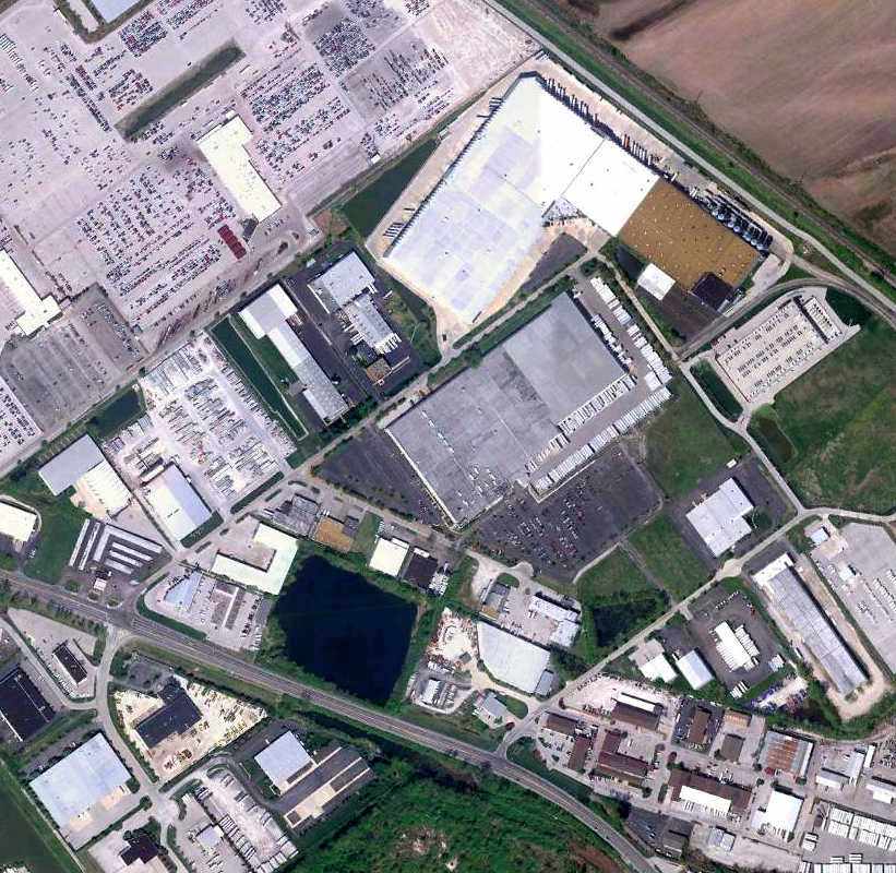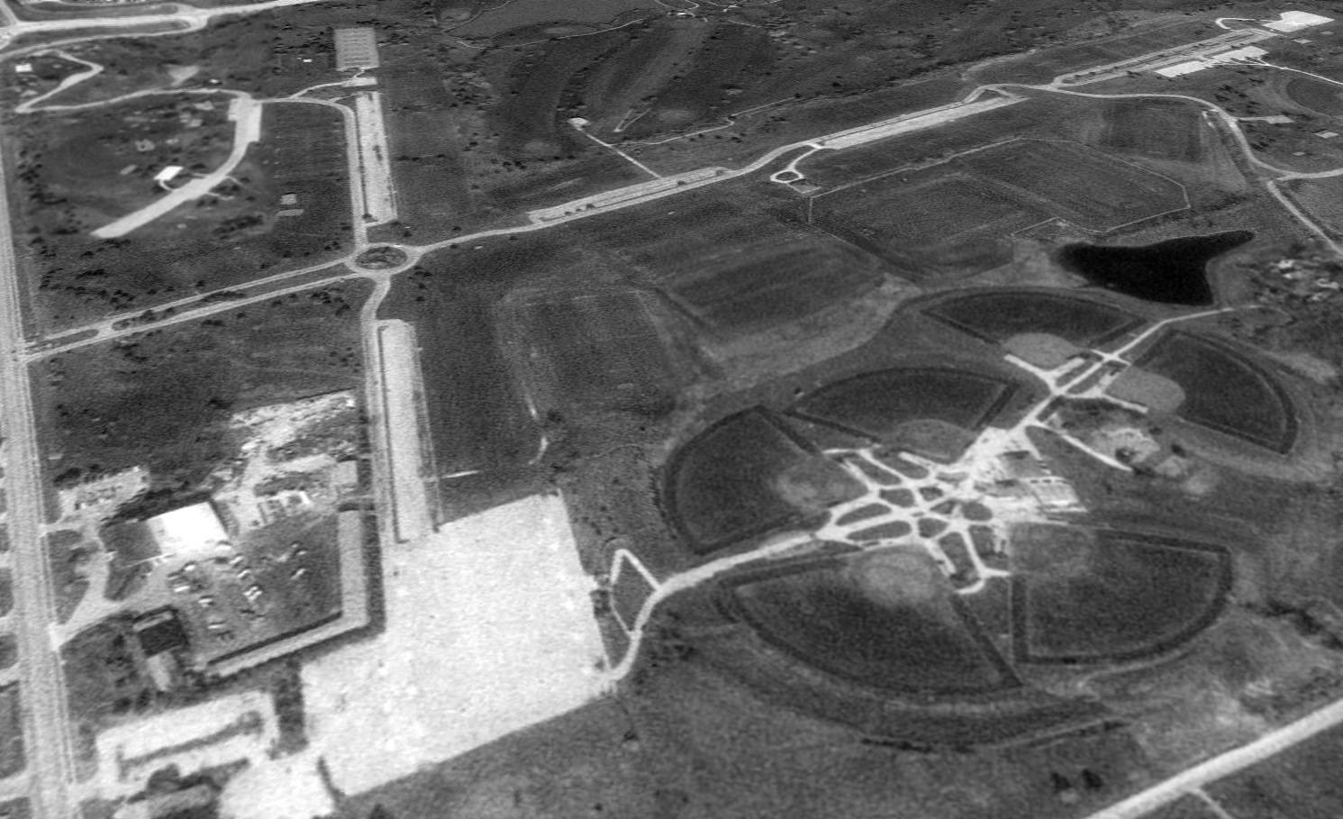 A circa 2006 aerial view looking west at 2 former hangars (top-center & bottom-left of photo)
