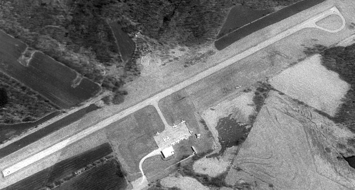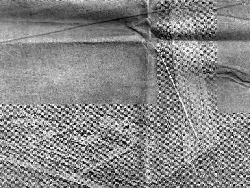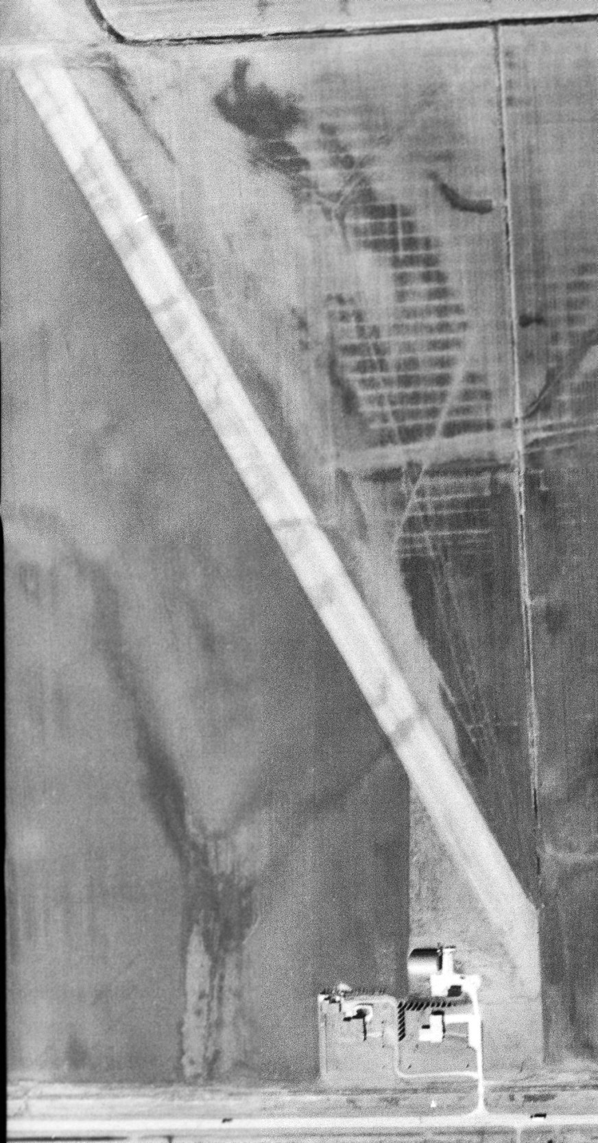 with a cluster of buildings at the southwest end, near which was visible a single aircraft.