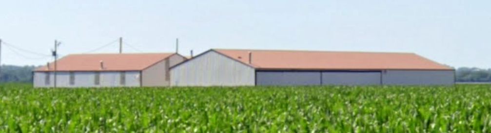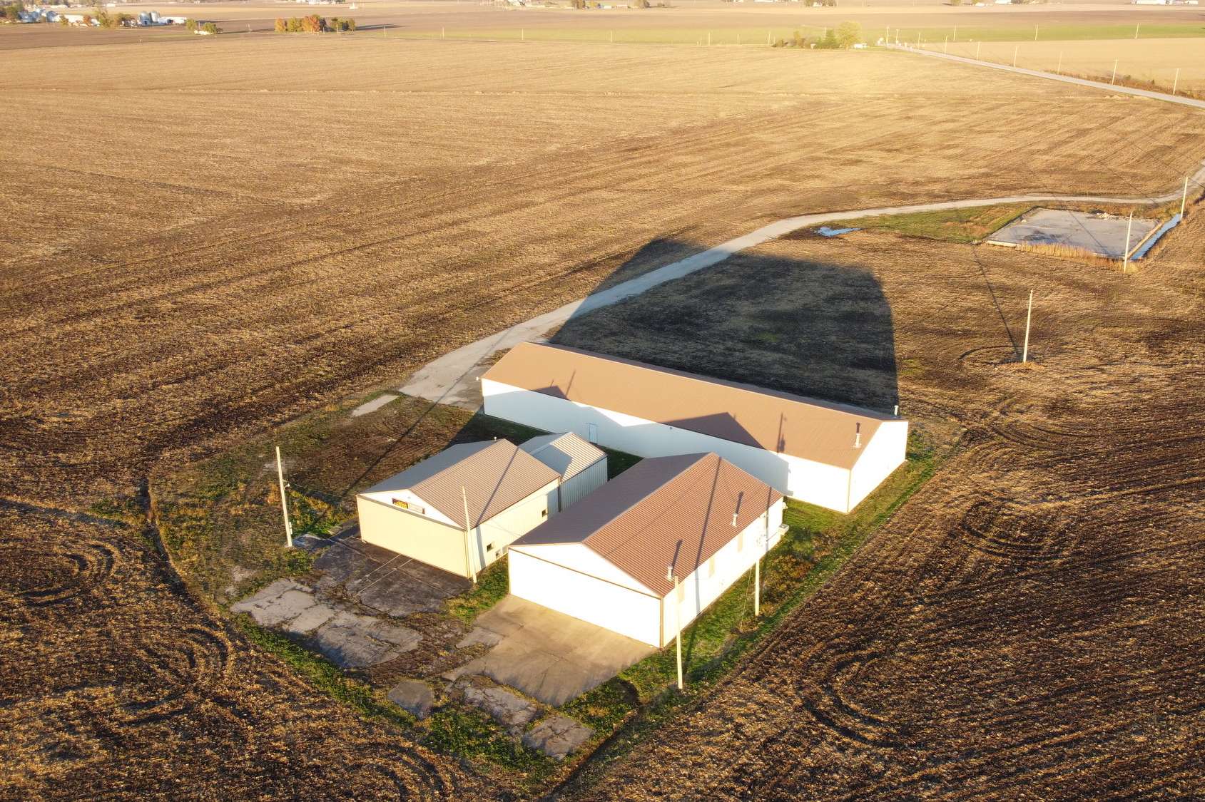 A 2023 photo looking north at the former Marceline Airport hangars.
