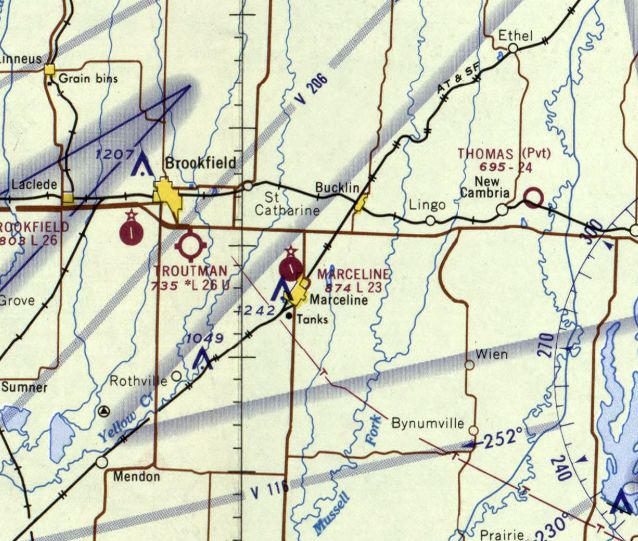 The last aeronautical chart depiction which has been located of Marceline Airport was on the February 1969 Kansas City Sectional Chart.