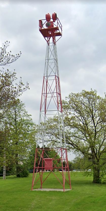 A 2022 photo looking west at the rotating beacon tower which remains on the southern edge of the Columbia Municipal Airport site.