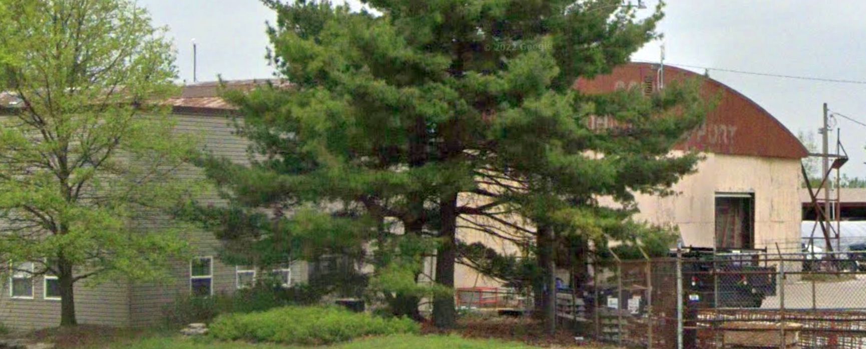 A 2022 photo looking northwest at the former hangar which still bears the lettering “Columbia Municipal Airport”.