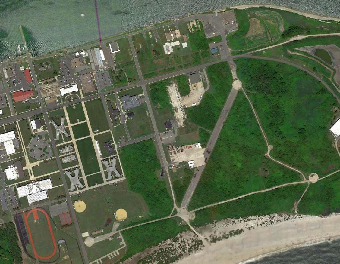 A 2015 aerial view depicted Cape May's post-WW2 Runway 3/21, along with the remains of pavement from the WW2-era Naval Air Station.