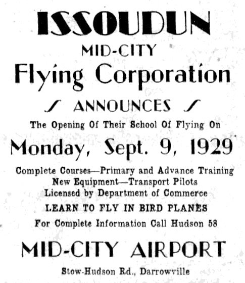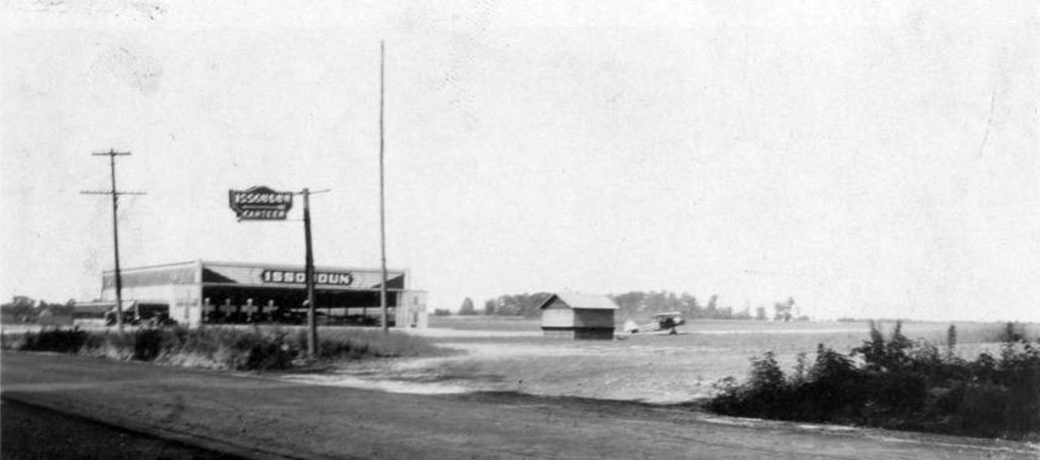 A circa 1930 photo of Mid-City Airport (courtesy of Bill Grasha) showed the Issoudon Canteen sign in front of the hangar labeled “Issoudon”, and one biplane on the field.