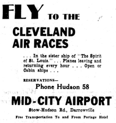 An advertisement for Mid-City Airport from the 8/24/29 Akron Beacon Journal (courtesy of Bill Grasha) offered flights to the Cleveland Air Races.