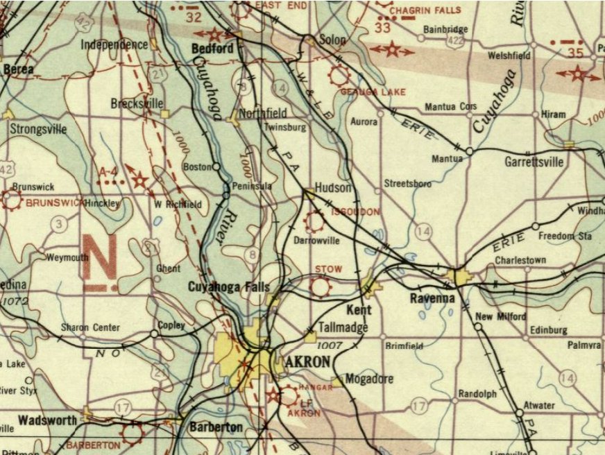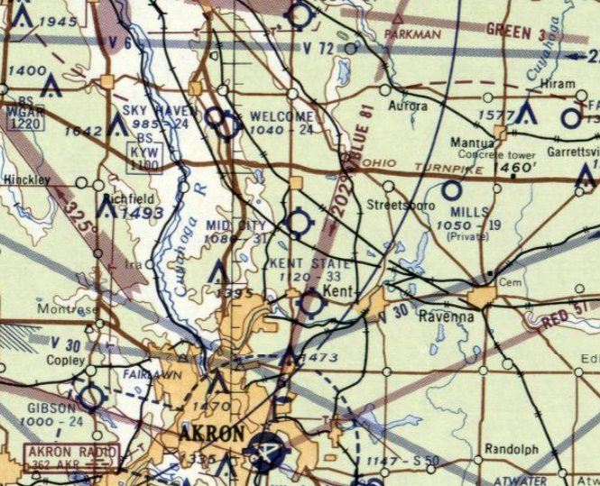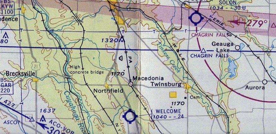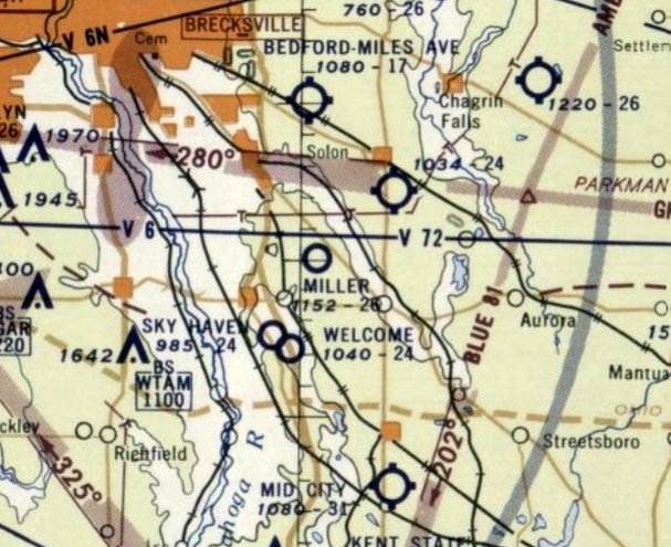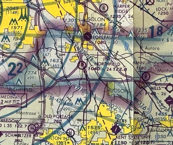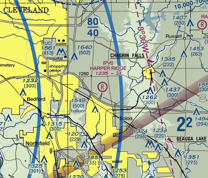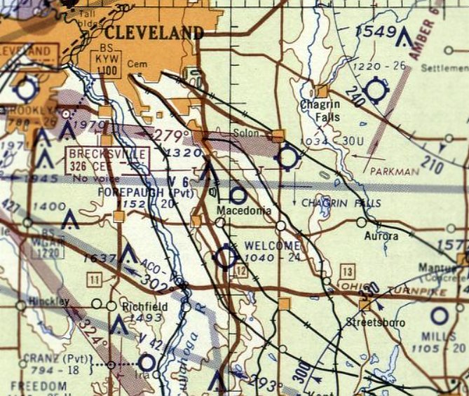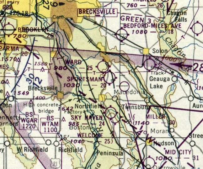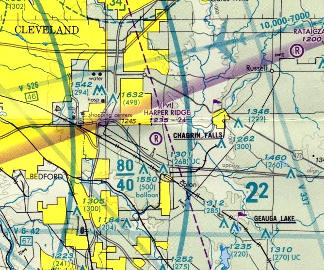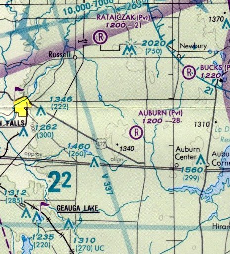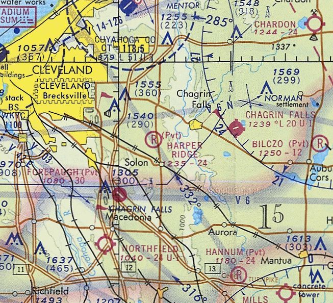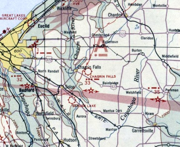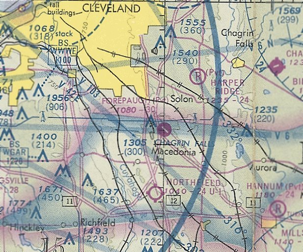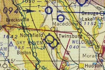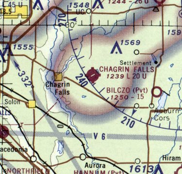 The last aeronautical chart depiction which has been located of Chagrin Falls Airport was on the May 1970 Cleveland Sectional Chart.