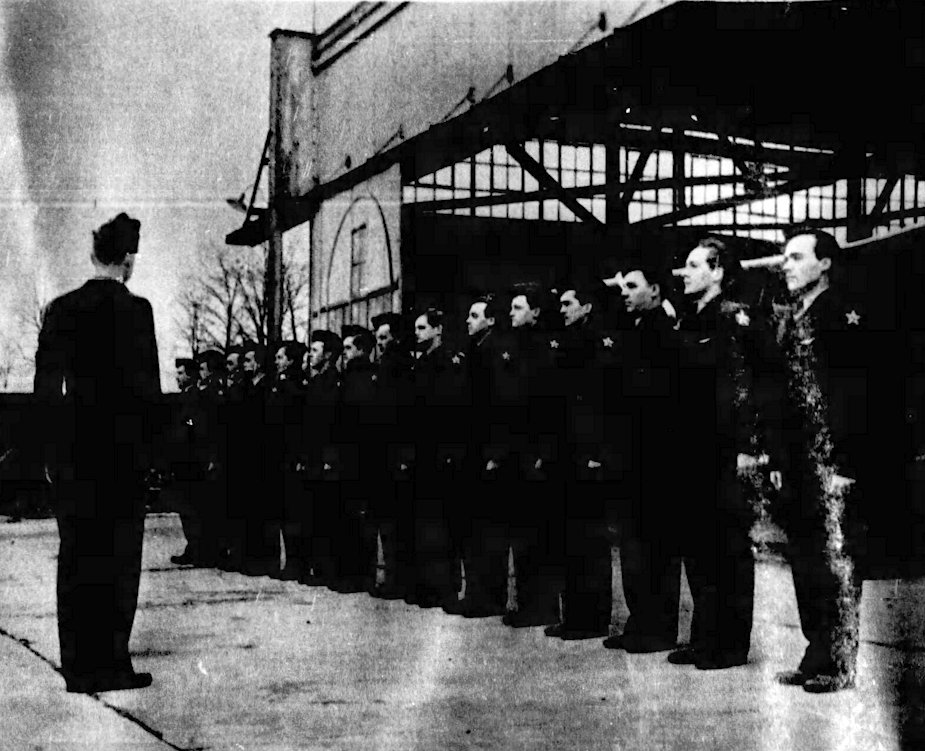 An undated photo of cadets in front of the Mid-City Airport hangar from the 2/28/43 Akron Beacon Journal Sun (courtesy of Bill Grasha).