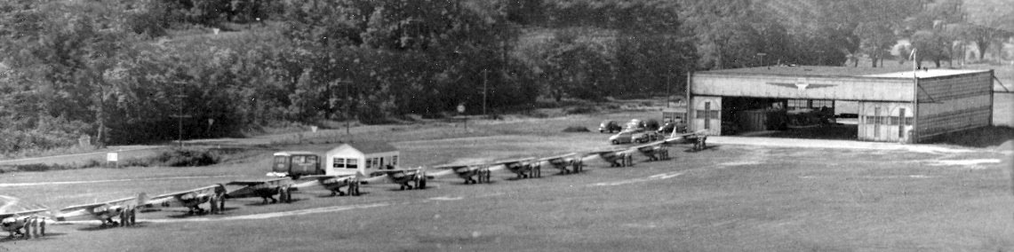 A 1943 aerial view of a line of a dozen Piper Cubs in front of the Mid-City Airport hangar (from the Van Devere Family Collection, courtesy of Bill Grasha).