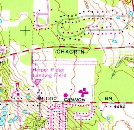 It depicted “Harper Ridge Landing Field” as having a single unpaved east/west runway, with a small building on the southwest side.