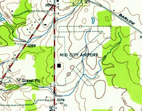 The 1953 USGS topo map depicted Mid City Airport as having 3 unpaved runways & a hangar on the west side.