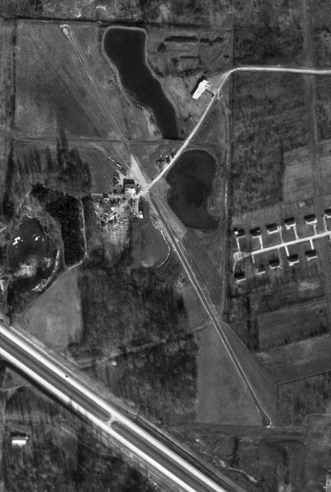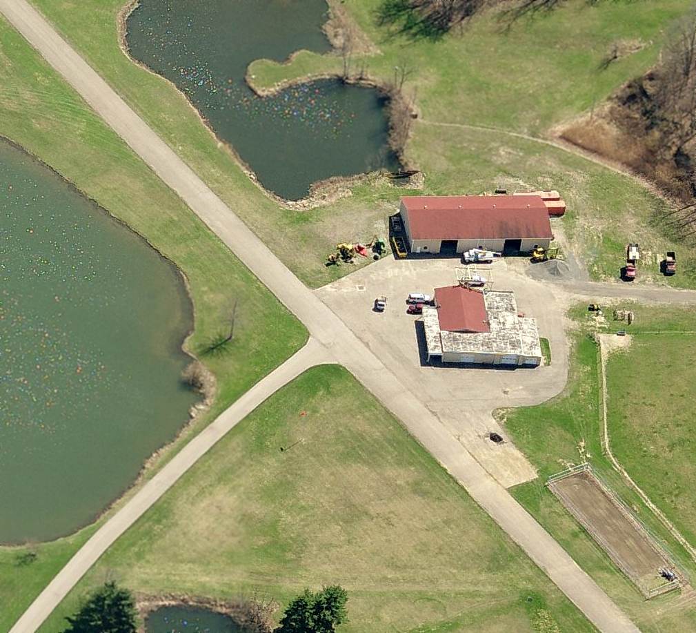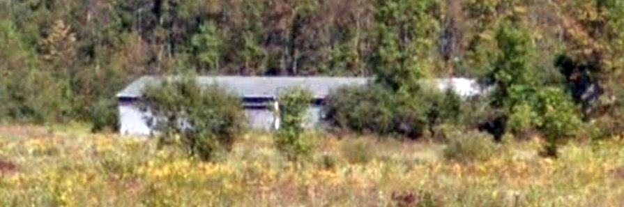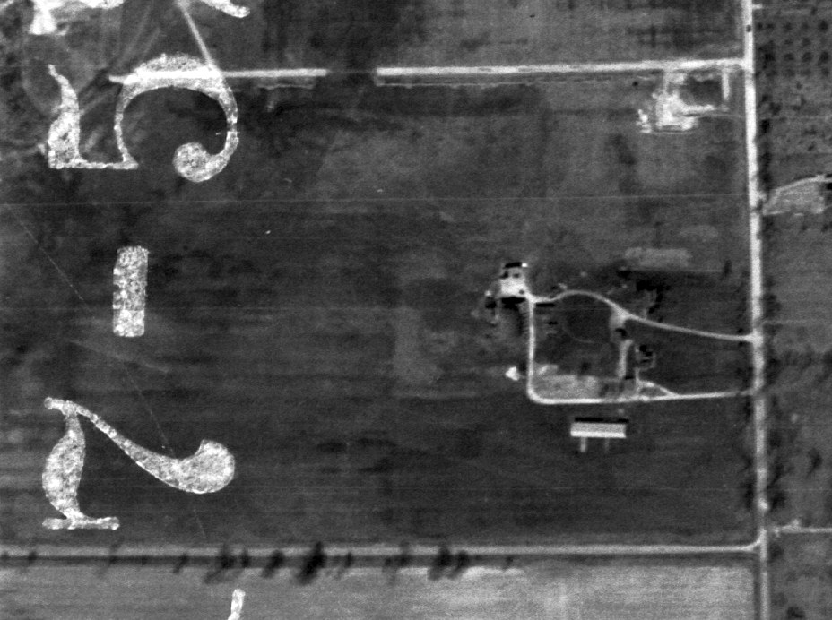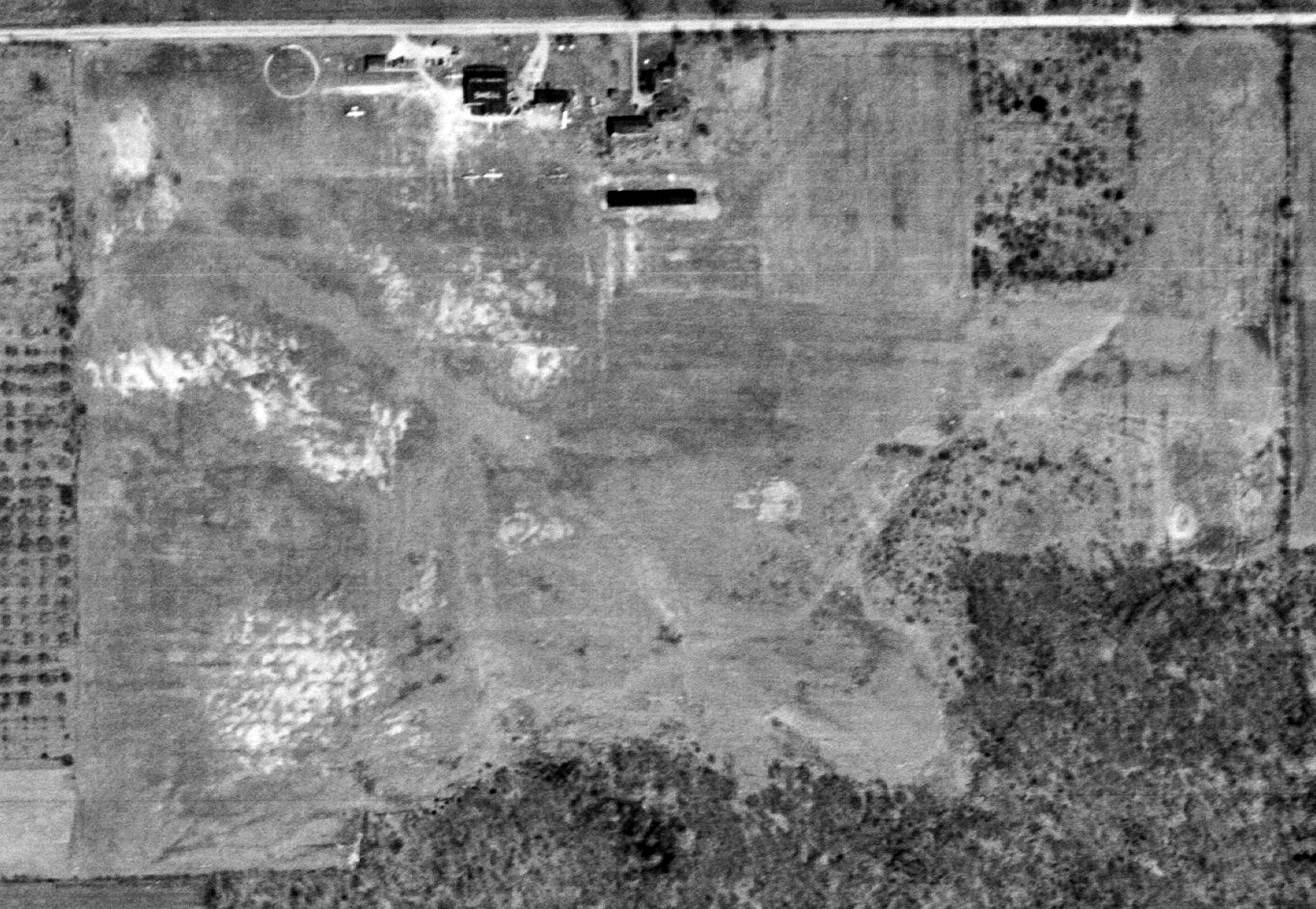A 2003 aerial view by Bruce Bream looking east showed Harper Ridge Airfield to remain mostly intact, with the grass runway & square area to the west still being cleared, and with a red foundation & another small building on the southwest side.