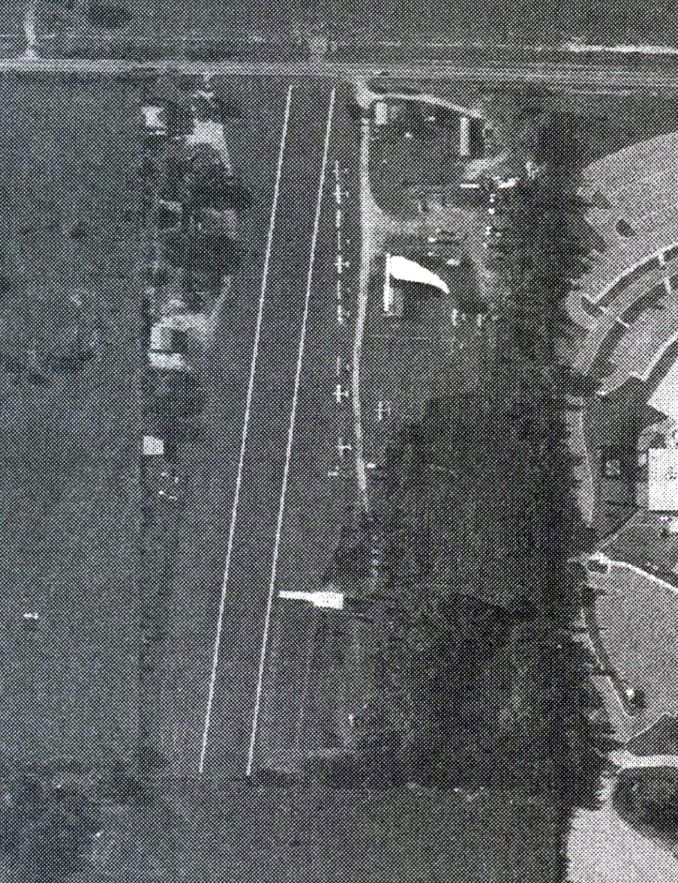 The photographer noted, “Even then the pavement was starting to fail. One of the 2 long row hangars can be seen to the right. The grass runway was on the left between the houses & the paved runway.”