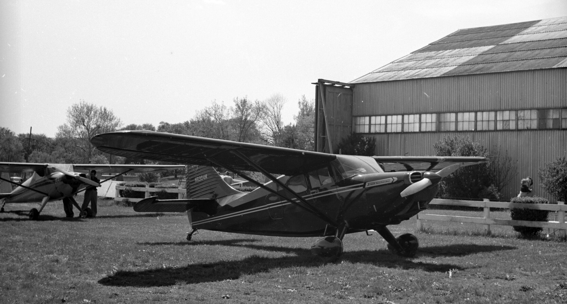 A 1956 photo by Joe Lyons II of Joe Lyons III in front of the Morrisville Airport hangar,