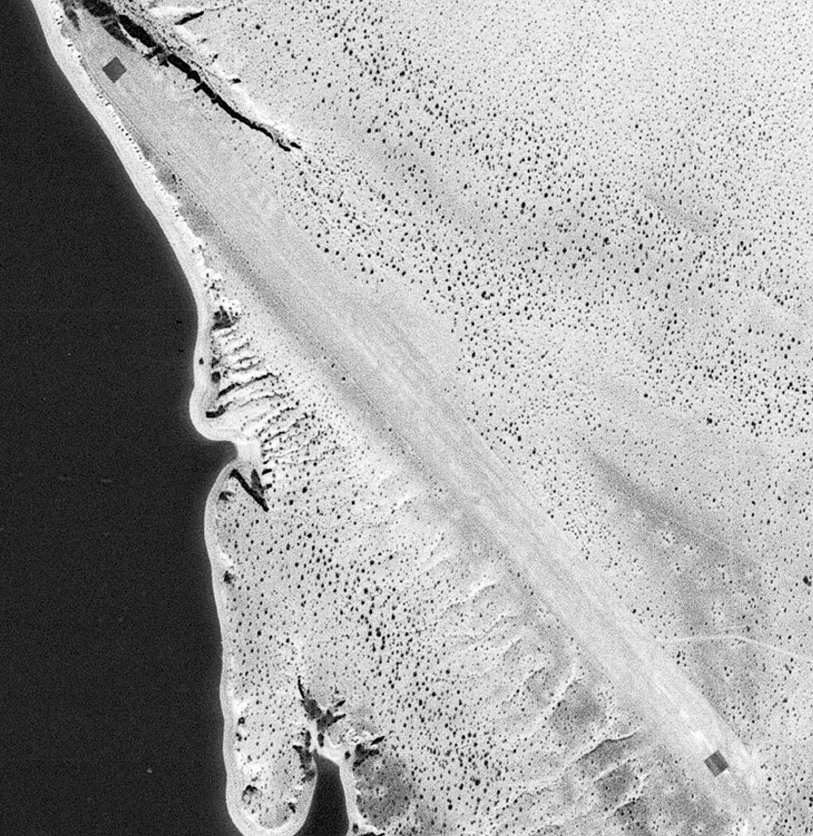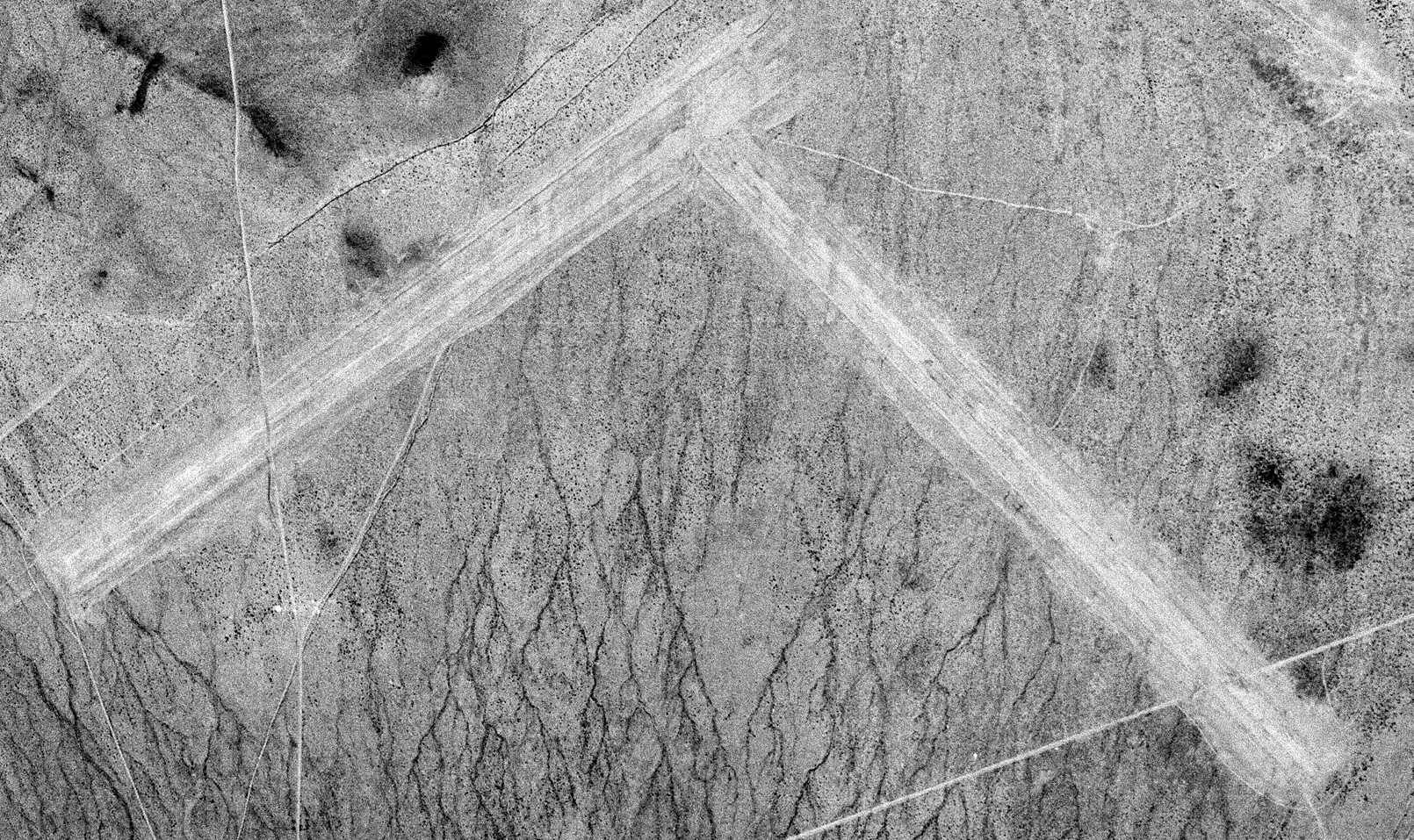 The runways must have been dirt & are completely overgrown with desert bushes of some kind, just like the surrounding area."