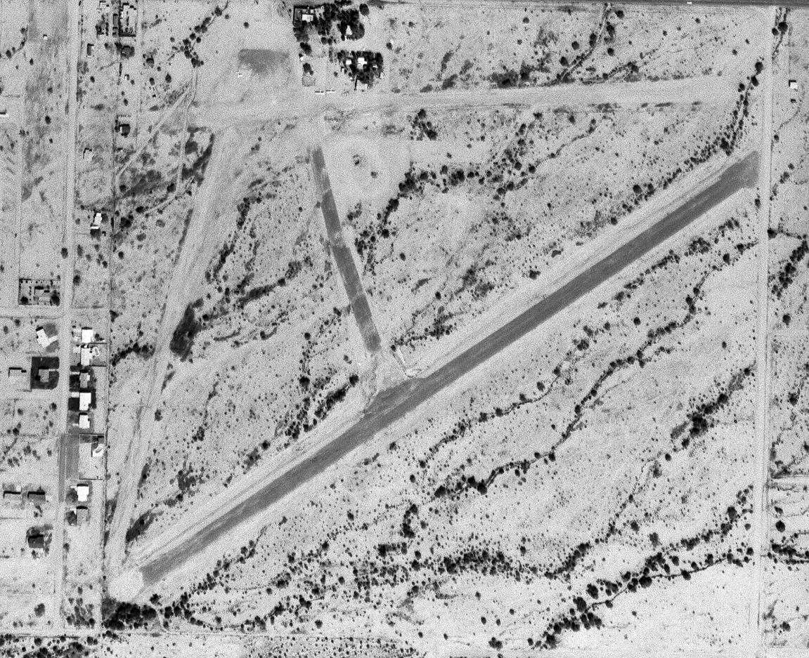 The 2 unpaved runways seen in the 1957 aerial view had been replaced by an asphalt (or oiled) northeast/southwest runway to the south.