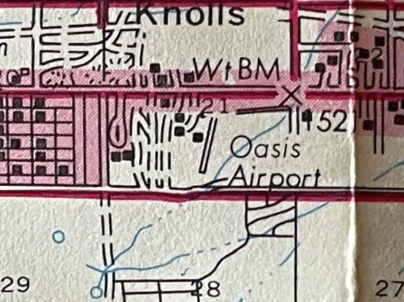 The only topo map depiction which has been located of Oasis Airport was on the 1956 USGS topo map (courtesy of Kevin Walsh).