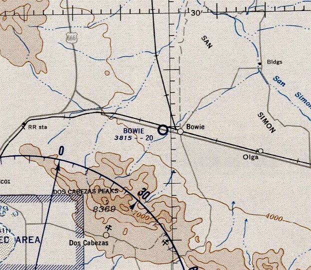 The last aeronautical chart depiction which has been located of the original Bowie Airport was on the March 1956 Phoenix Sectional Chart.