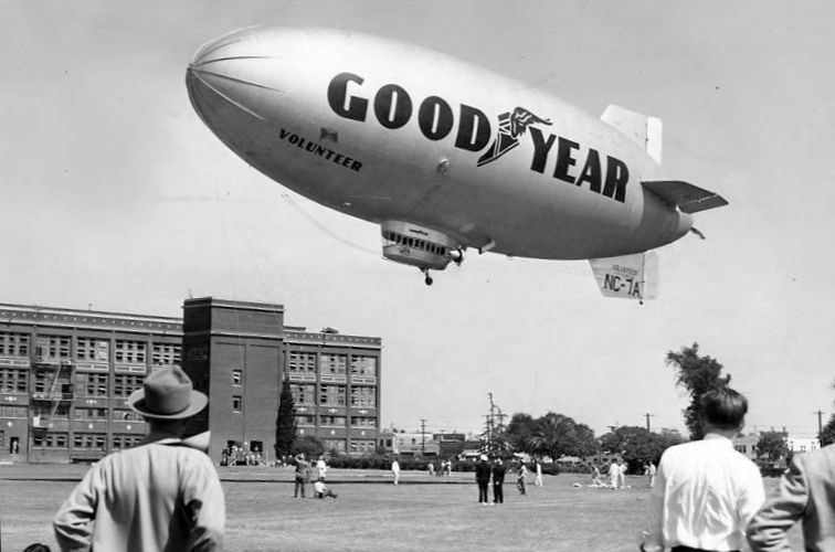 A circa 1950 photo of a Goodyear blimp over Culver City Airport, with a row of aircraft visible along the north side of the runway.