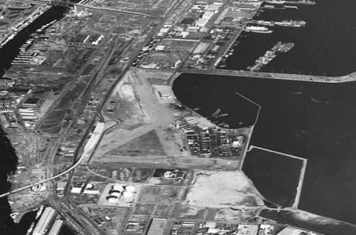 A 1980 aerial view showed that 3 large hangars still remained standing on the south side of the former Terminal Island airfield.