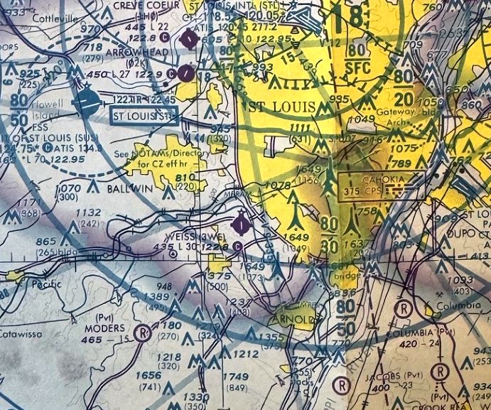 Weiss, Sylvan Beach, and Meramac Airports, all depicted in very close proximity on the 1948 Kansas City Sectional Chart (courtesy of Chris Kennedy).
