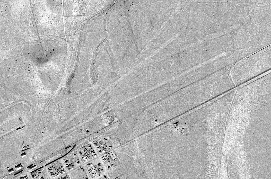 It depicted 3 unpaved runways, with some small buildings on the southwest side.