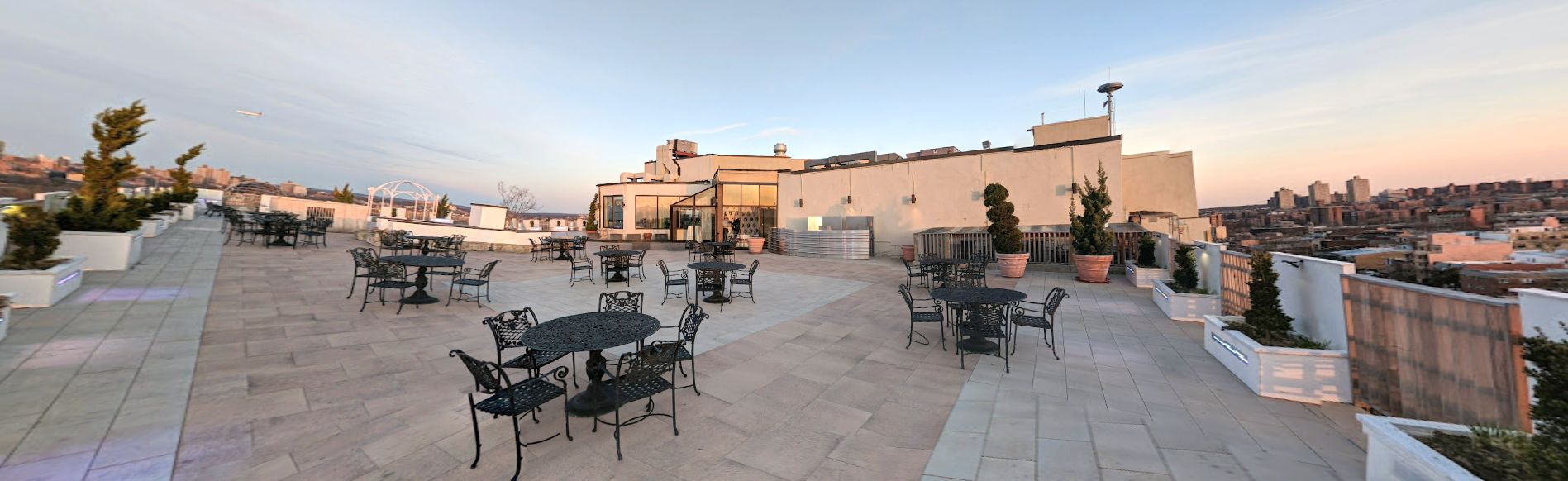 An April 2019 photo looking southeast at the rooftop terrace which occupies the site of the Worlds Fair Heliport.