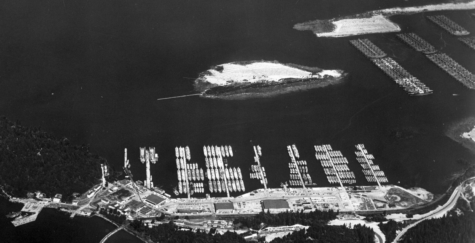 A 1958 aerial view looking east showing over 100 mothballed ships in storage at Tongue Point & nearby Mott Island.