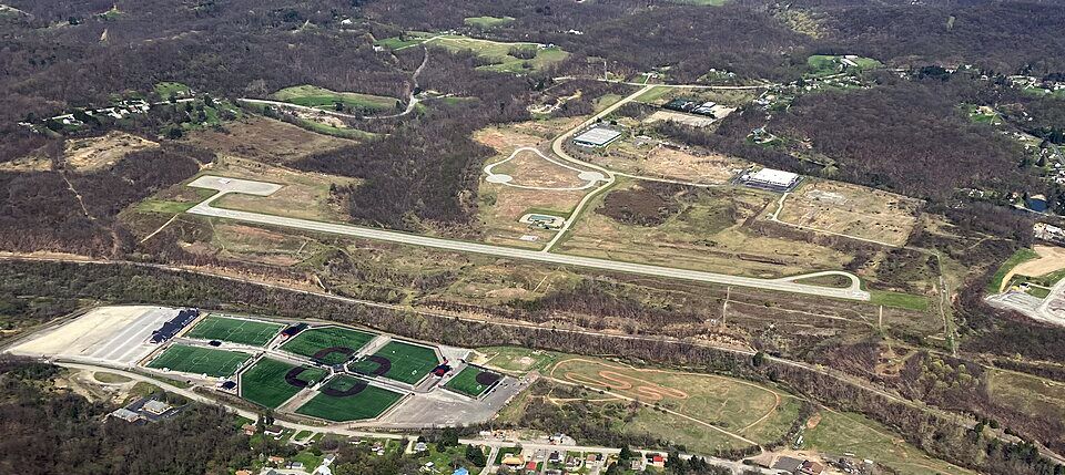 A 2023 aerial view looking south along Pittsburgh-Monroeville Airport's Runway 23.