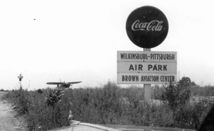 A circa 1950 photo of a sign for Wilkinsburg-Pittsburgh Airport's Brown Aviation Center(courtesy of Jon Ostlund), with a light single-engine taildragger visible in the background.