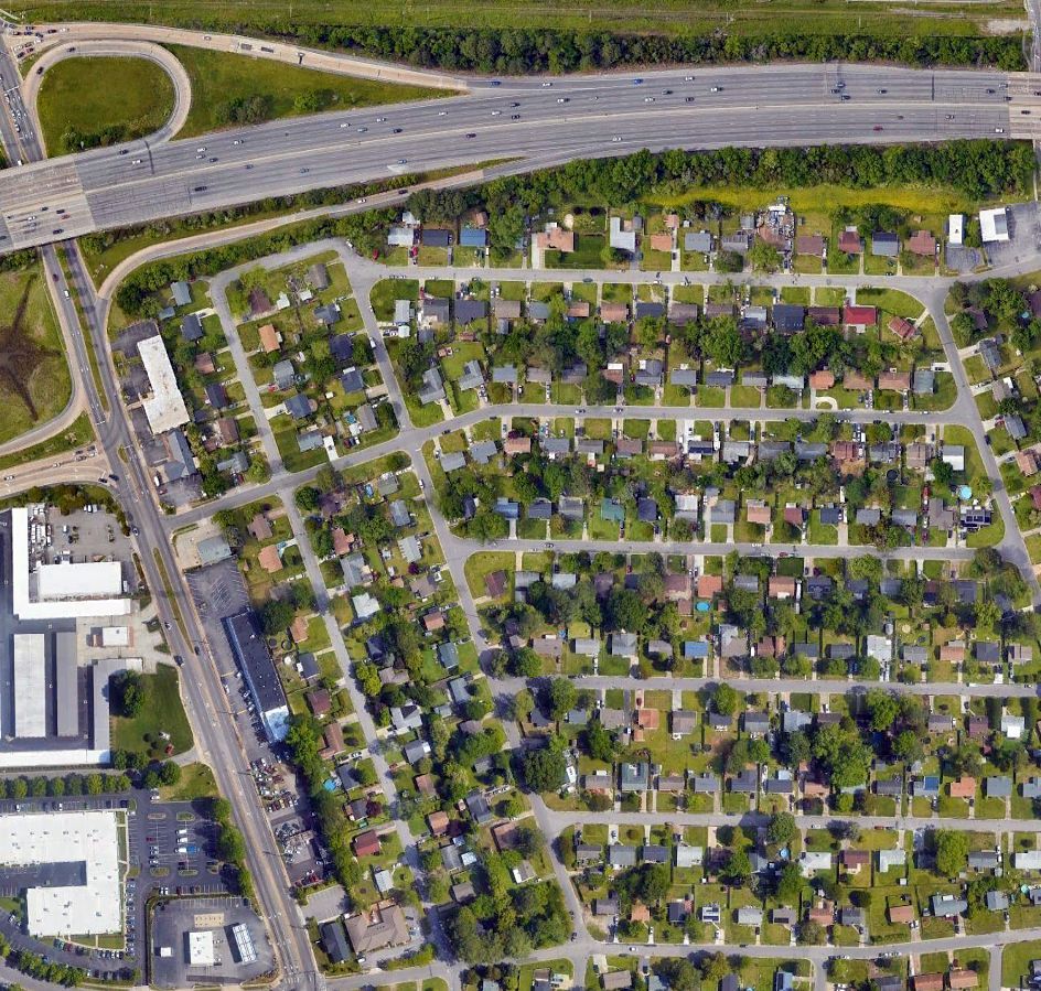 A 1958 aerial view showed a residential neighborhood had covered the Thalia Airport site, but traces of what may have been a northeast/southwest runway were perceptible.