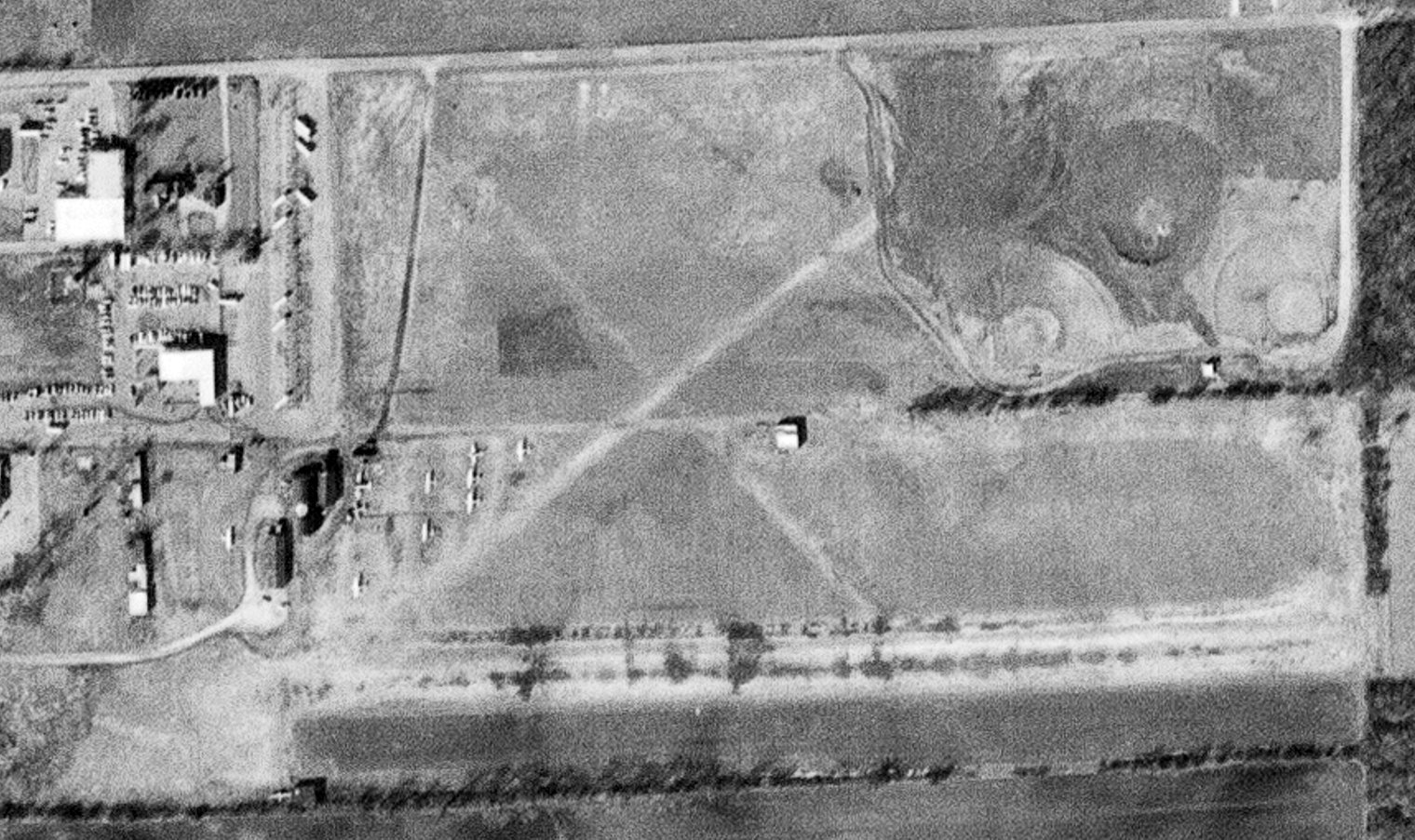 A circa 2006 aerial view shows large closed-runway “X” symbols which are still maintained on either end of the massive former runway,