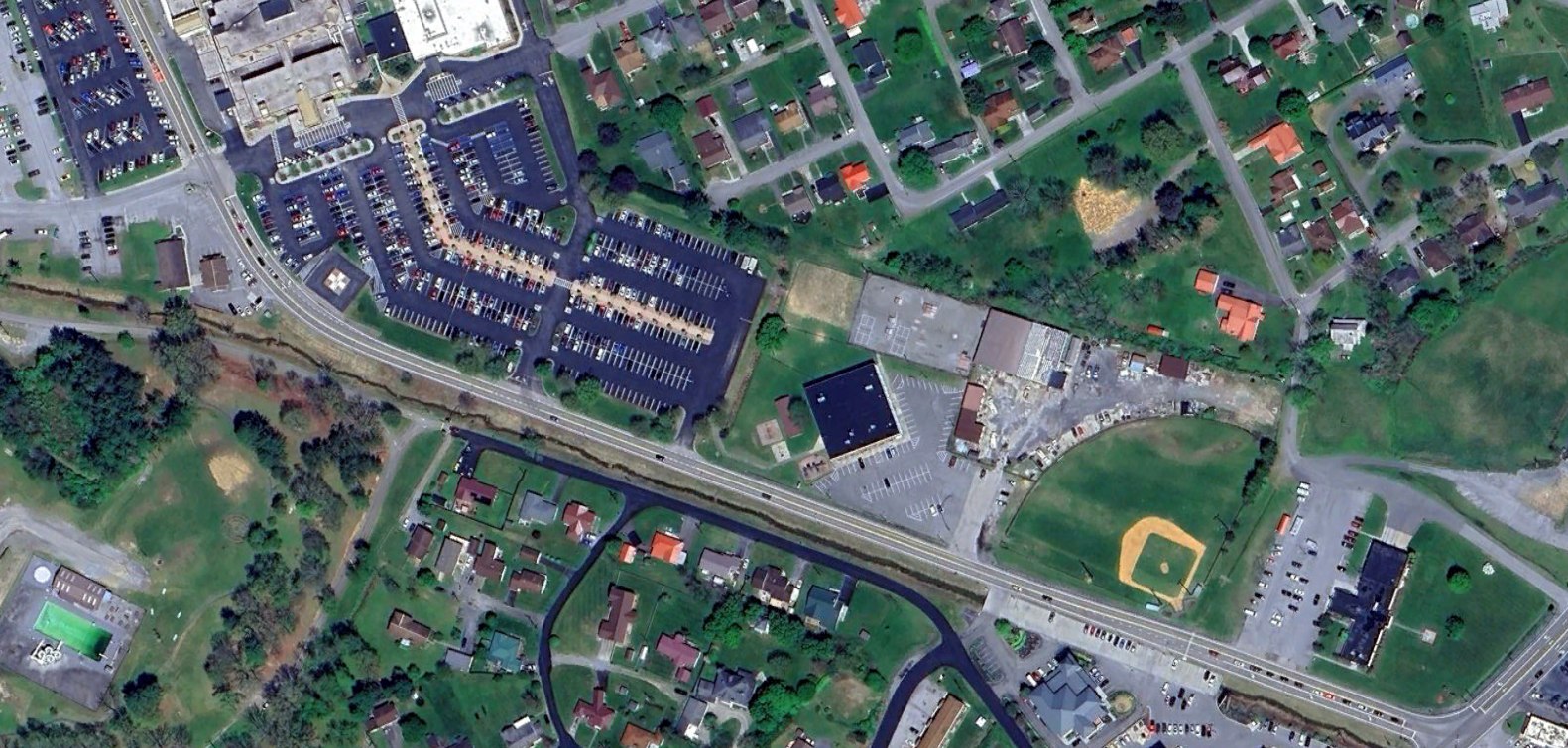 the former Greenbrier Airport was noticeable as a relatively long span of pavement, painted with abandoned runway "X" markings,