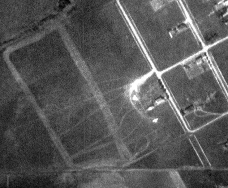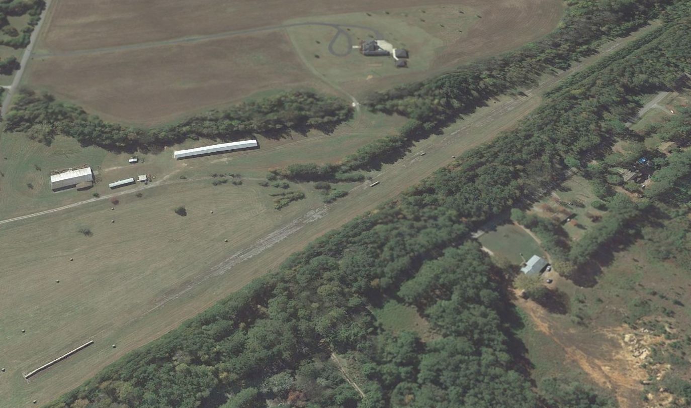 showed possibly a single grass east/west runway, with a few small buildings (hangars?) on the east side.