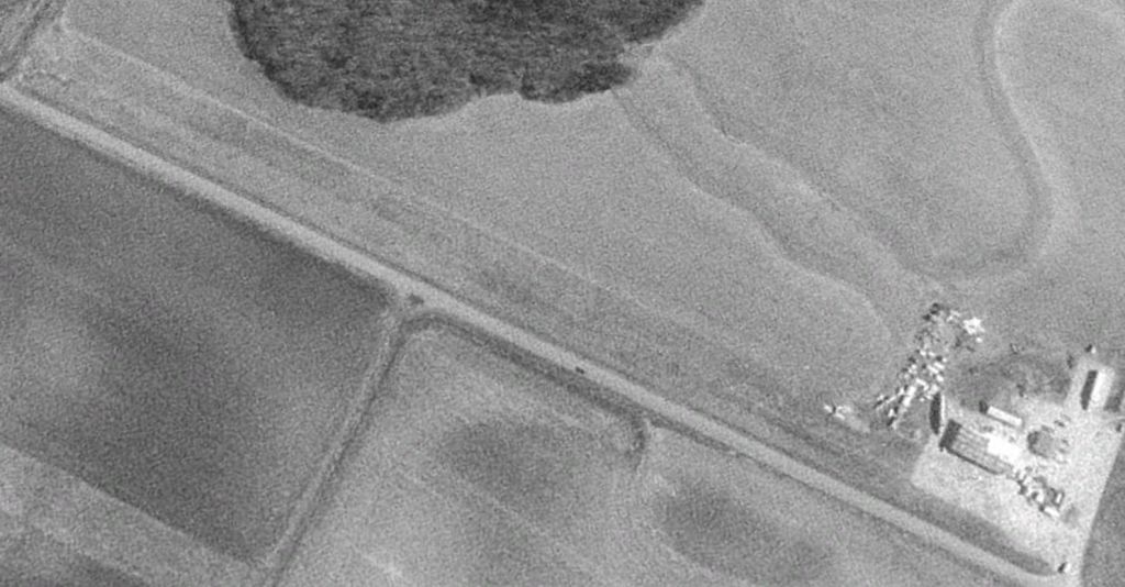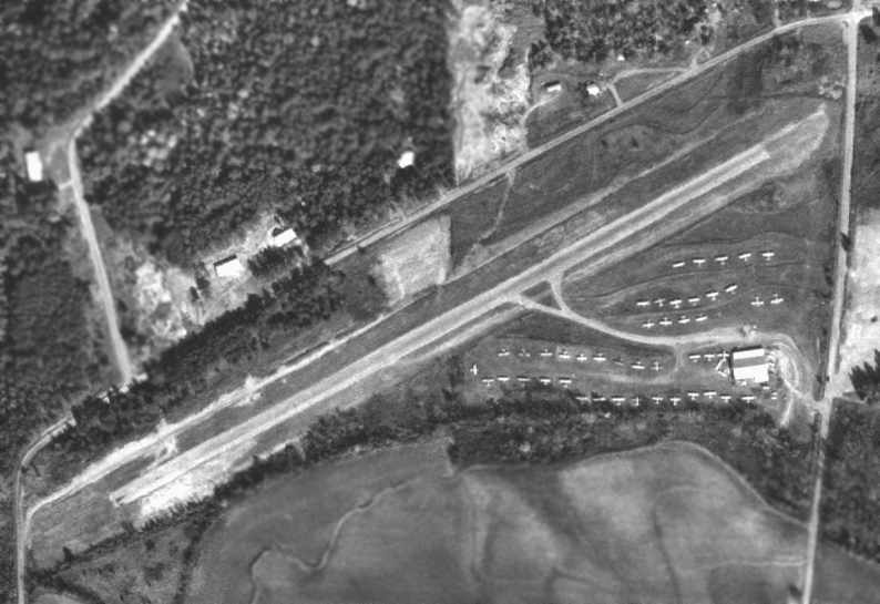 which depicted it as having a single unpaved north/south runway, with a small building on the southeast side.
