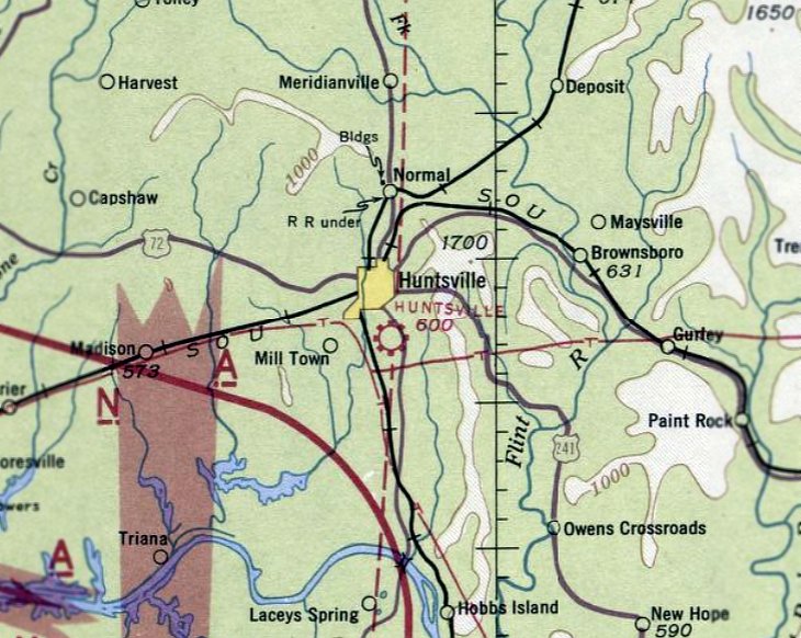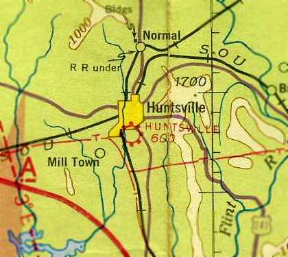 the original Huntsville Airport was no longer depicted (having been replaced by a new field somewhat to the south).