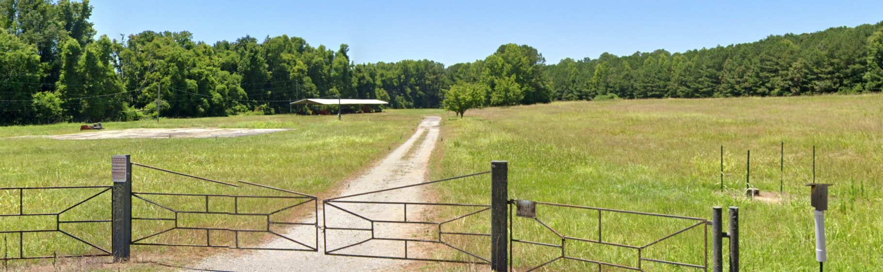 A 2019 photo looking west at the former South Huntsville Airport hangar, a shade hangar, and site of the runway.
