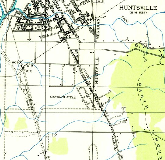 The earliest aeronautical chart depiction which has been located of the original Huntsville Airport
