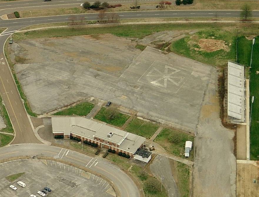 A circa 2001 aerial view looking south at the former Huntsville Airport terminal building, showing a helipad just beyond it.
