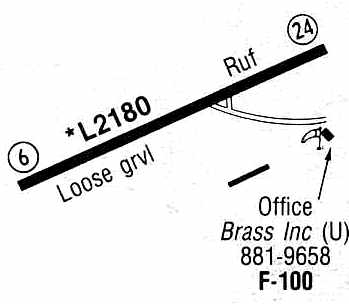 A taxiway led to the office of Brass Inc. on the southeast corner of the field, and another long building (t-hangars?) was depicted south of the runway.