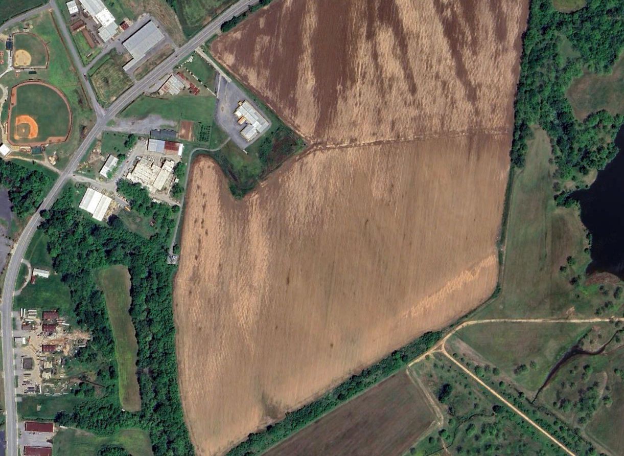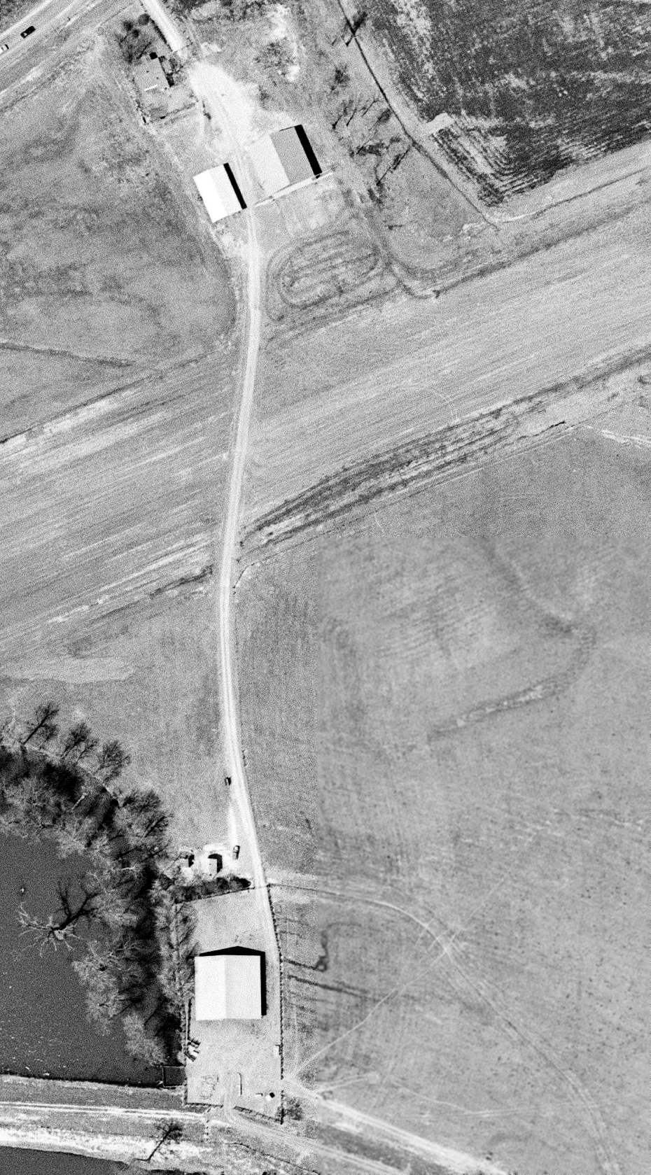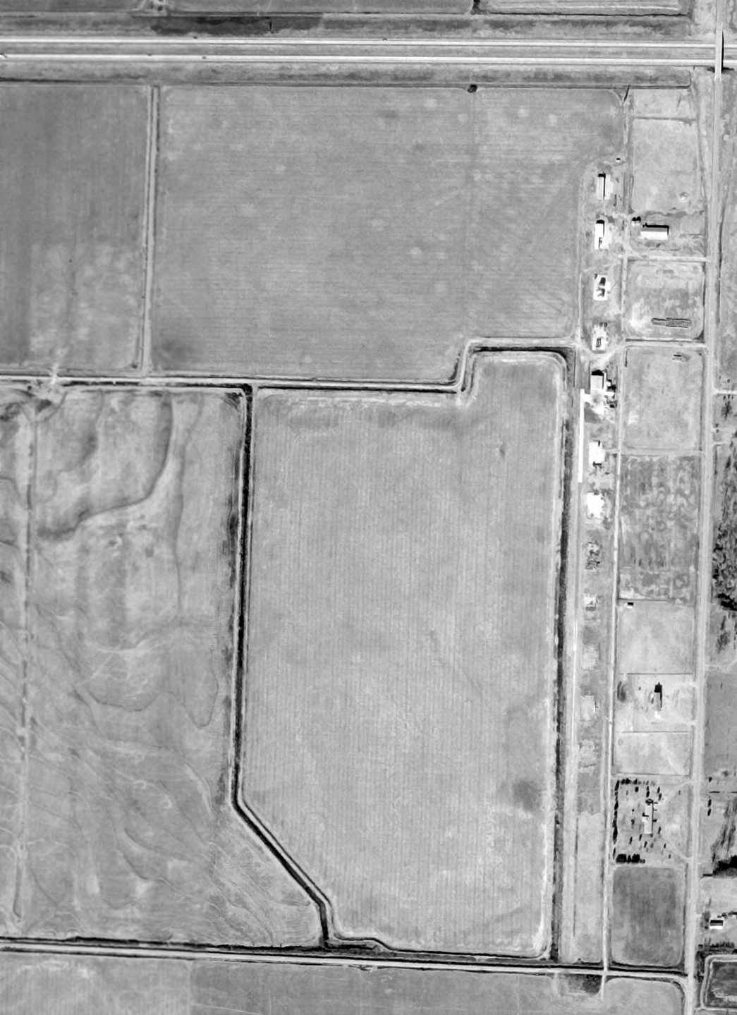 A 2023 aerial view shows the former Toney Field hangar remains intact along the west side. The majority of the former airfield remains clear, being used for farming.